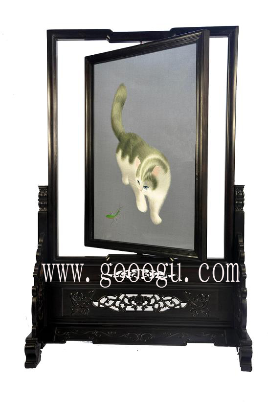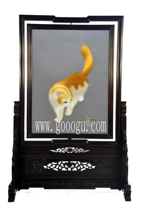 走進嬌古蘇繡的展廳,我們驚嘆于陳列室里作品的浩繁與精致,先來看傳統題材的作品?;B繡是蘇繡傳統產品,它是明清時期閨閣繡的延續。蘇繡工藝品《小 貓》、《金魚》曾在國際上得獎,《小貓》的名氣在于貓眼用二十六種不同顏色的絲線繡成;《金魚》的輝煌則是魚尾最細處僅用一根線的四十八分之一。蘇州各大 旅游景點也屢見小貓金魚的姿態,如何擺脫蘇繡工藝品的匠氣,使俗氣的工藝品成為震撼人心的藝術品,這是嬌古蘇繡多年來苦苦研究的問題。看,這幅現代 刺繡藝術品《貓》。同樣是貓,傳統的貓講究具體,形象,栩栩如生。而我們面前的兩幅《貓》:一幅白底白貓,一幅黑底黑貓。貓在哪里?貓在白色里,貓在黑色 里,貓在你無盡的想像里。想像之上,具象已與抽象結合起來,達到了藝術升華。同是蘇繡作品,構思變了,功底卻不改,《貓》作品之外給人的聯想可謂余音裊裊。 |